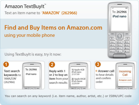 Este novo serviço o TextBuylt, permite que os consumidores escrevam o nome do produto que querem comprar no seu telemóvel, o número do código de barras ou o ISBN do mesmo, enviando-o para o número 262966, o equivalente a escrever Amazon em modo de escrita inteligente.