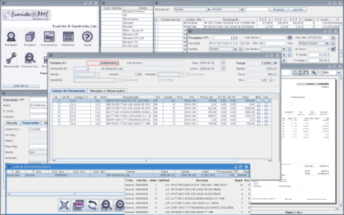 Suportando as necessidades básicas da sua Empresa dispõe de funcionalidades como: emissão de guias de remessa, facturas, notas de crédito e débito, gestão de encomendas, stocks e situação financeira de Clientes e Fornecedores, cotações de Produtos, compras em moeda estrangeira além de um sofisticado gerador de listagens integrado ( JasperReports).