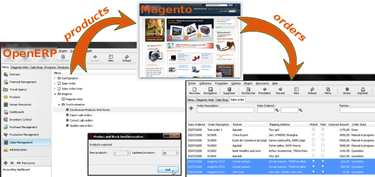 2) Sale orders export from Magento to OpenERP, with customers and their adresses synchronisation; sale order status update.