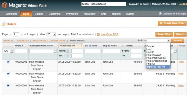 A extensão permite que se escolha quais as ordens de compra que serão exportadas. O processo de exportação é muito simples sendo suficiente a partir da página de registo de ordens, seleccionar a opção “Export to .csv file”.