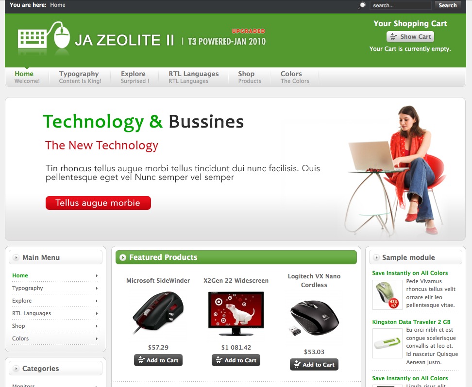 O template JA Zeolite é um template moderno que valorizará de forma considerável o seu catálogo ou loja online. Concebido para uma integração completa com o Virtuemart 1.1.2, este template além das funcionalidades já presentes em templates como o JA Mesolite, e o JA Larix confere uma melhor visualização de produtos ao incluir os módulos JA slideshow e JA Content Scroll.