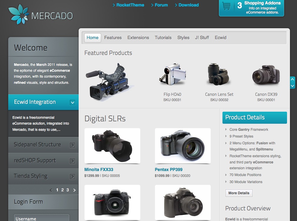 O template foi desenvolvido específicamente para os componentes Ecwid, redSHOP e Tienda.