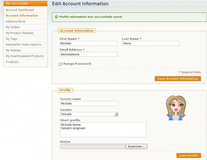 A extensão Customer profile permite que os clientes de uma loja magento possam efectuar o upload do seu avatar e adicionar uma pequena descrição ao seu perfil.