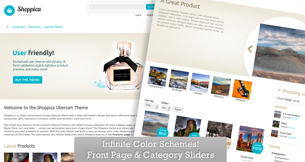 O primeiro tema, Shoppica, é um dos temas mais avançados que existem para Drupal Commerce. O tema permite a personalização de cores, inclui sliders para a apresentação de categorias e produtos, as características dos produtos podem ser apresentadas em forma tabular e a funcionalidade zoom existe para a melhor visualização das imagens dos produtos.